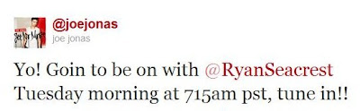 @joejonas: 'Yo! Estarei on com @RyanSeacrest na terça-feira de manhã às 7:15 am PST, sintonise!!'